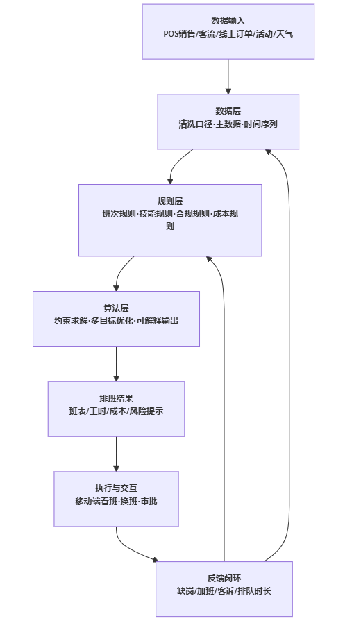 割裂会带来两个直接后果:第一,系统很难解释排班为什么这样排,业务不信任;第二,排班难以形成闭环改进——排班效果(客诉、排队时长、缺岗、加班)无法反哺规则参数,只能在会议里凭经验争论。久而久之,“我们需要定制开发一个更聪明的排班”就成了管理层的直觉答案。