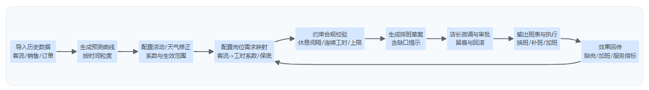 | 分时段客流匹配 | 峰值缺人、低峰闲置 | 时间粒度、需求曲线、岗位系数、保底人数 | 服务水平更稳、减少临时加人 |