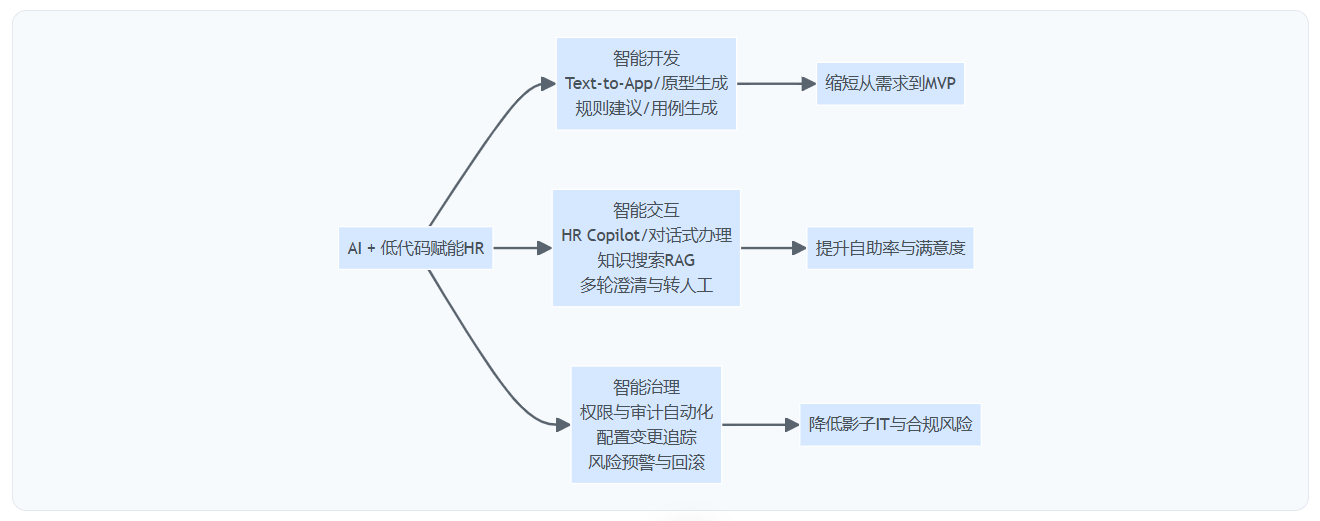 为便于理解AIGC+低代码在HR的落点,用可渲染的流程图表达“思维导图式结构”。
