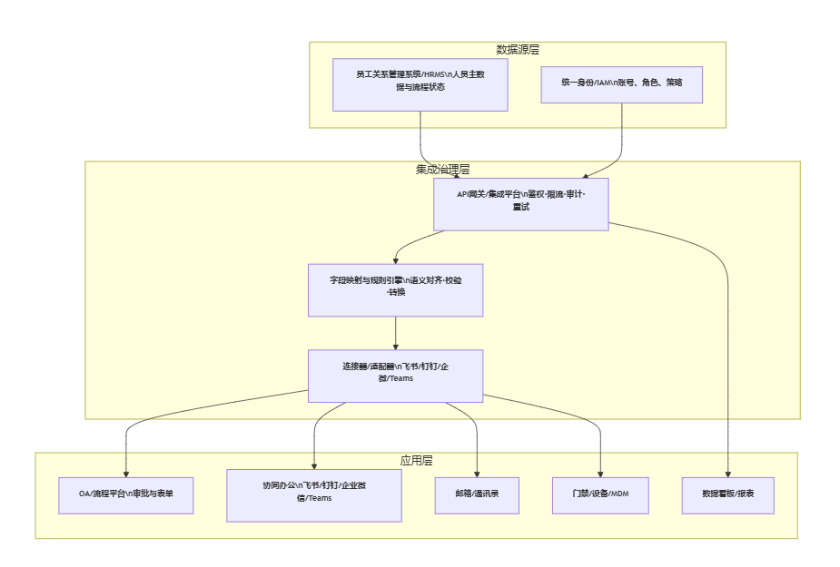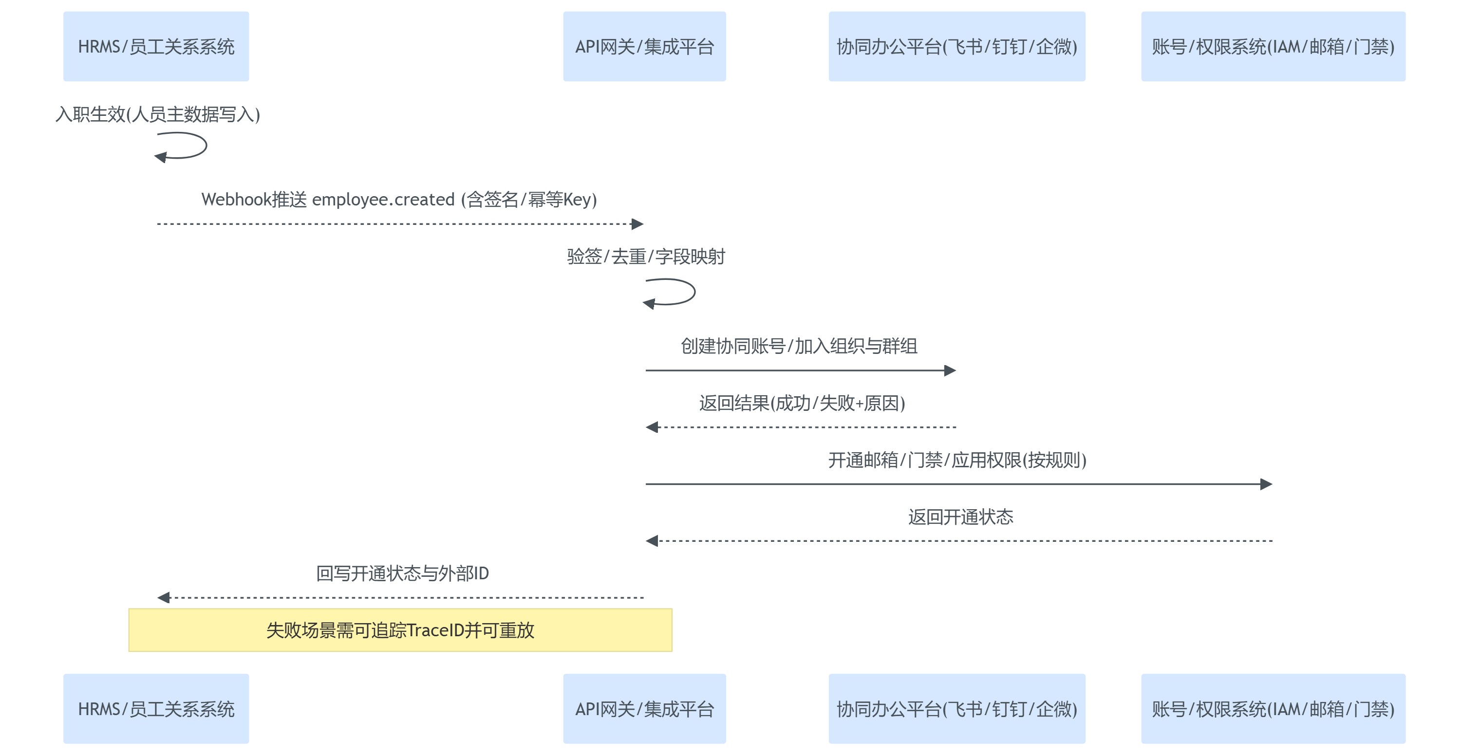 | 审批发起与回写 | 协同端发起、HRMS校验、审批结果回写、失败重放 | 在协同端发起请假/调岗,检查HRMS状态、日志、追踪ID | 避免口径分裂,实现流程闭环 |