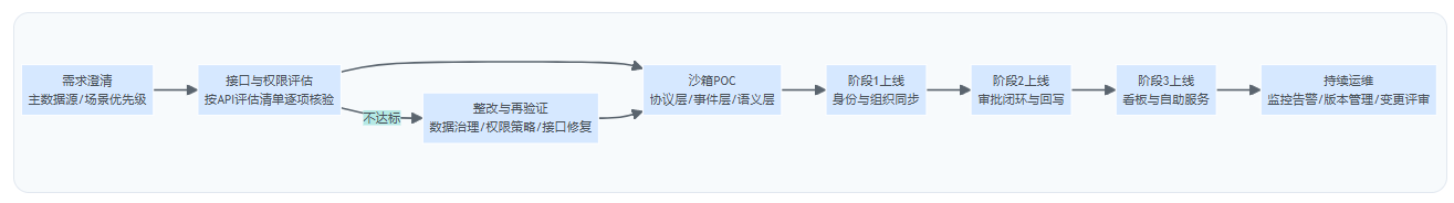 针对平台差异,清单里还应加入“厂商适配策略”条款,例如:是否提供官方连接器/应用市场上架版本、是否承诺连接器随平台API变更同步升级、是否提供版本化变更日志。没有这些,企业就会在平台升级时被动救火。下一部分我们把评估结果落到实施路径,避免“评估很严,上线仍失控”。