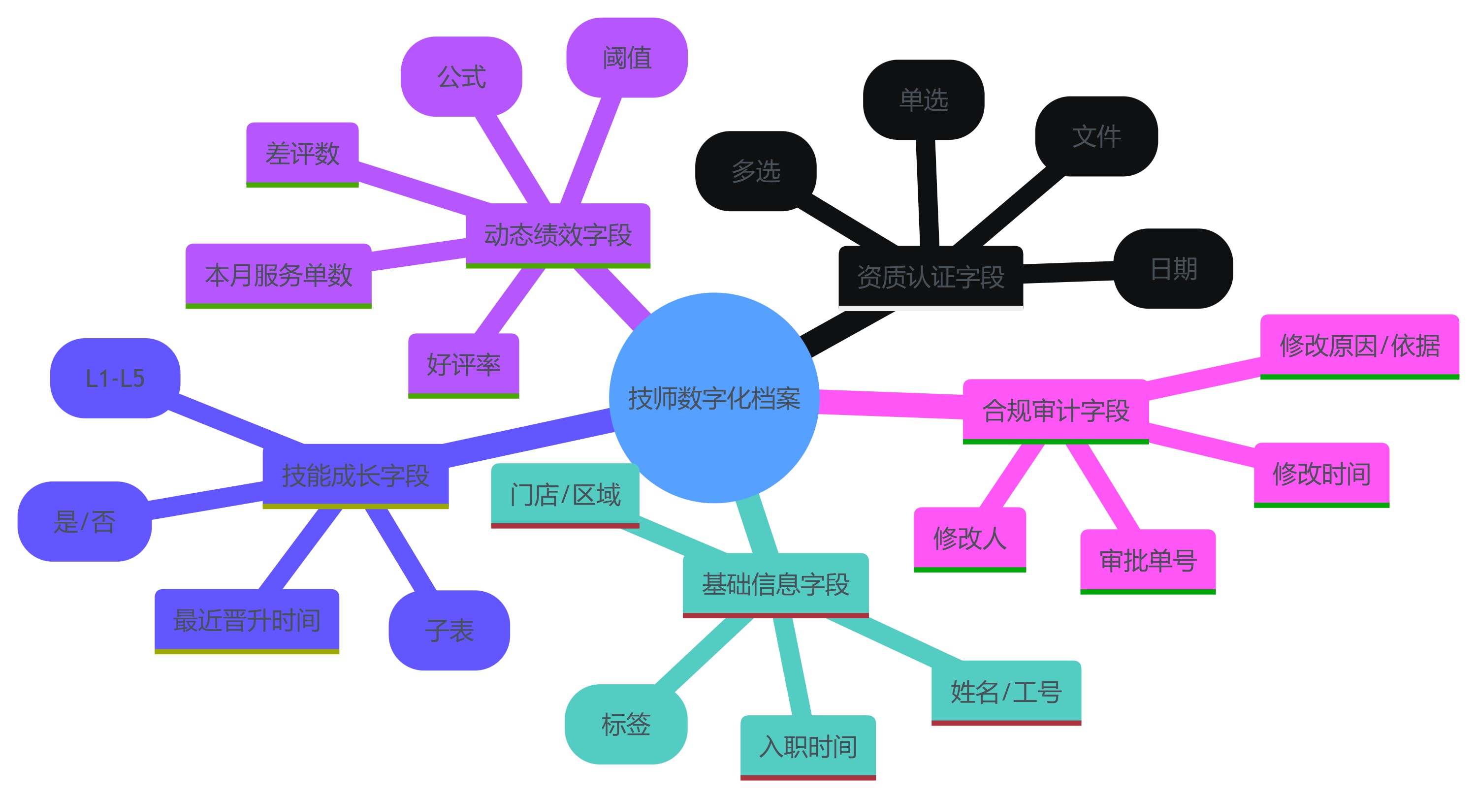 为了让字段体系在门店端更容易理解,我们建议把技师档案的字段分成几类,让一线知道“哪些是必填、哪些是系统自动算、哪些需要审批”。