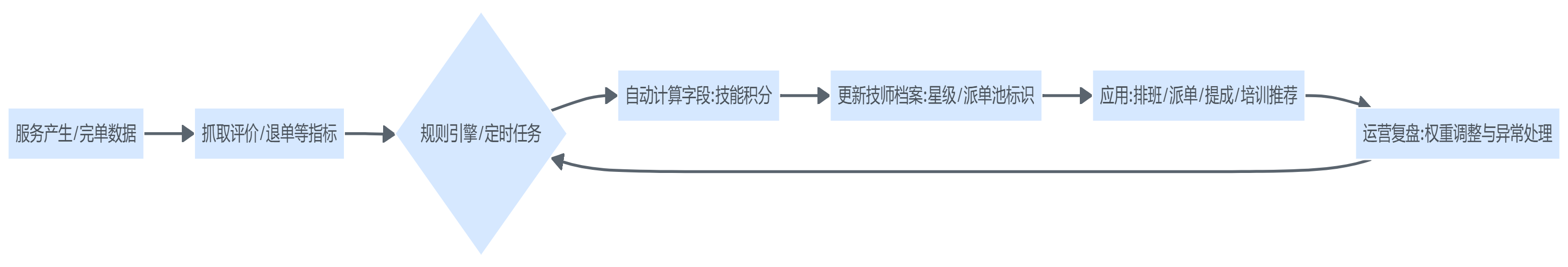 | 动态积分型(量化/实时) | 绩效口径分散、激励不精准 | 数值(积分)、公式字段(计算)、标签(星级) | 每日/每周重算;阈值触发星级变化;进入不同派单池 | 数据驱动排班与激励,减少“大锅饭” |