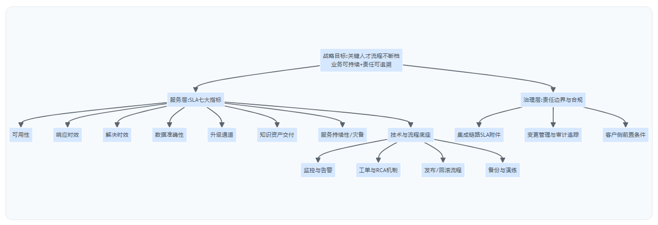 从实践看,一份“只谈响应时间、不谈取证与审计”的SLA,在发生薪酬争议或干部流程质疑时,往往无法提供自证材料。下面我们用一张全景图把SLA体系的结构化关系呈现出来,便于后续逐项落地。