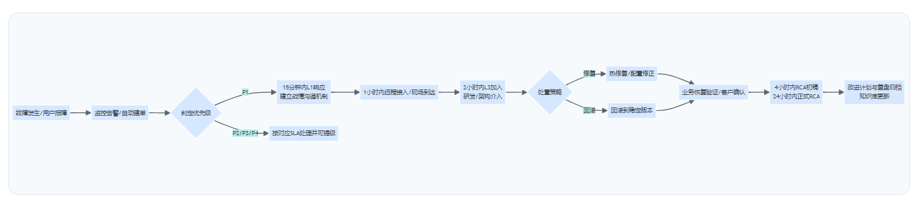 - 把P1闭环做成制度:响应、接入、升级到L3、RCA交付、复盘与知识库更新,用同一事件ID贯穿。
