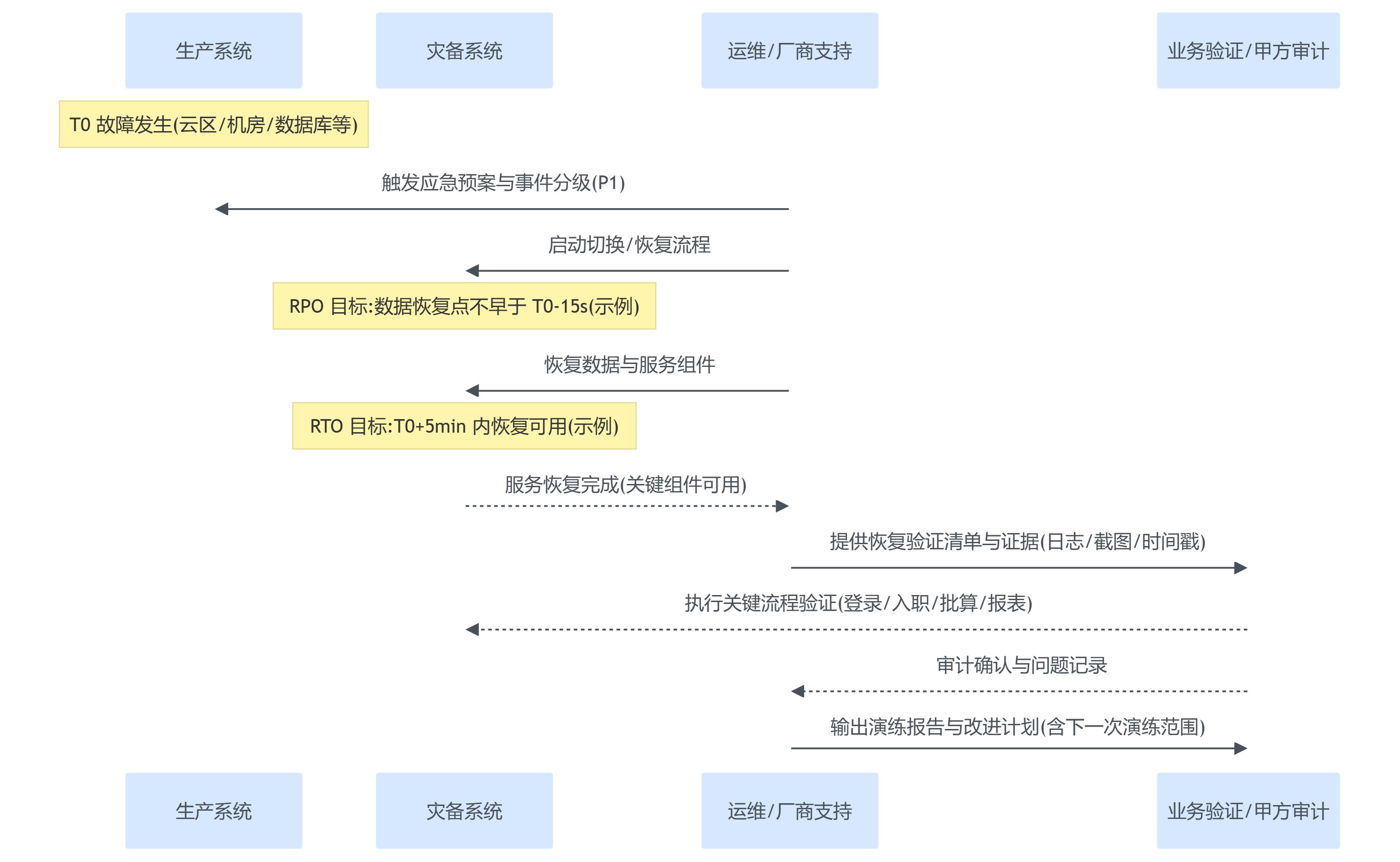 - 审计权与证据:客户是否可旁路审计演练过程,是否可获取关键日志、恢复验证证据与演练报告。