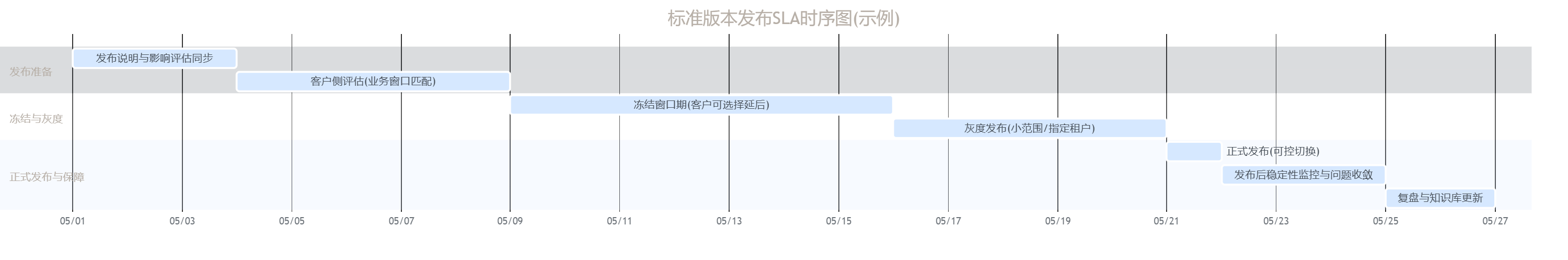 | 业务适配 | 版本通知与冻结窗口 | 提前通知≥10-15工作日;冻结≥7天(示例) | 中 | 校准周强制升级、培训返工 |