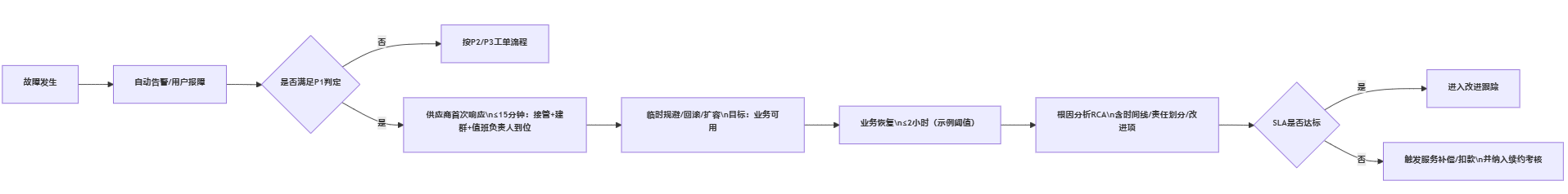 - P1首次响应时效:从故障被识别/报障到供应商明确接管并启动应急的时间。