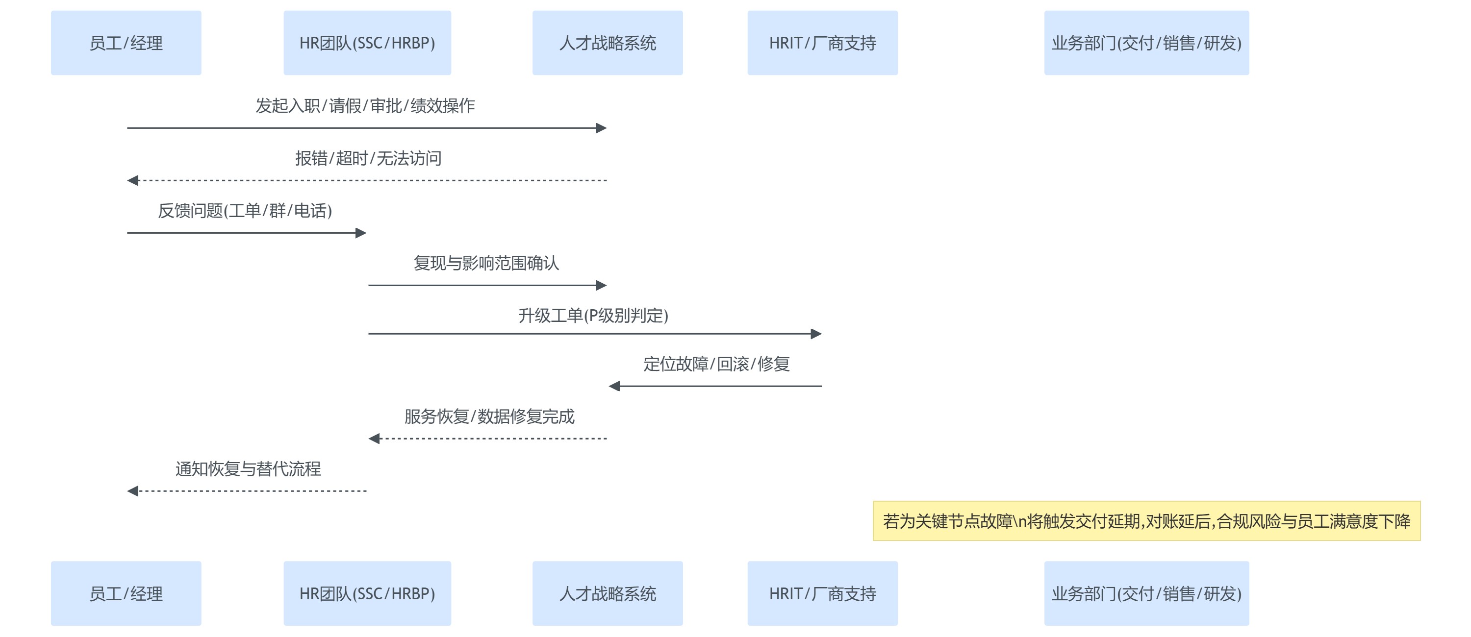 - 响应口径不一致:同一类故障在不同人手里得到不同处理方式;对外沟通随意,导致业务对HR/厂商的信任持续折损。