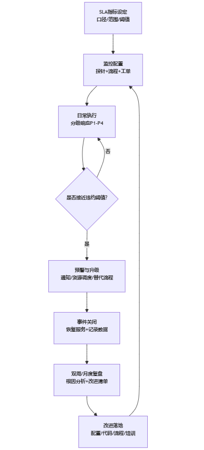 SLA的作用,就是把“优先级争夺”和“口径不一致”转化为可执行的规则:什么算P1、谁负责确认、多久必须响应、多久必须恢复、恢复到何种状态算完成,并且把过程数据记录下来用于复盘。可以把它理解为扩张期的“服务仪表盘”——速度提升时,必须同步提升可控性(本模块仅此一处类比)。