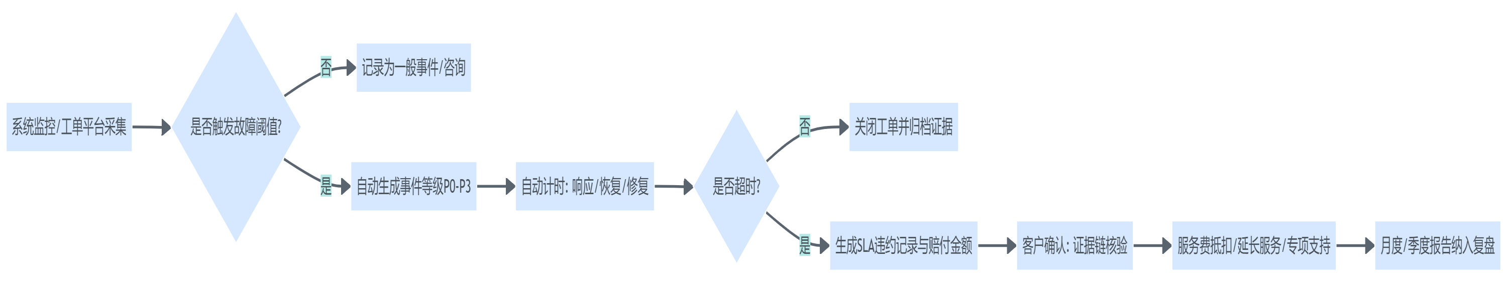边界条件:如果企业坚持只通过电话/微信群报障而不走工单,或不愿接入监控埋点,自动触发难以实现。这种情况下,至少要把“报障信息要素清单”(时间、截图、影响范围、联系人、复现步骤)写入SLA,并指定双方认可的时间戳来源。