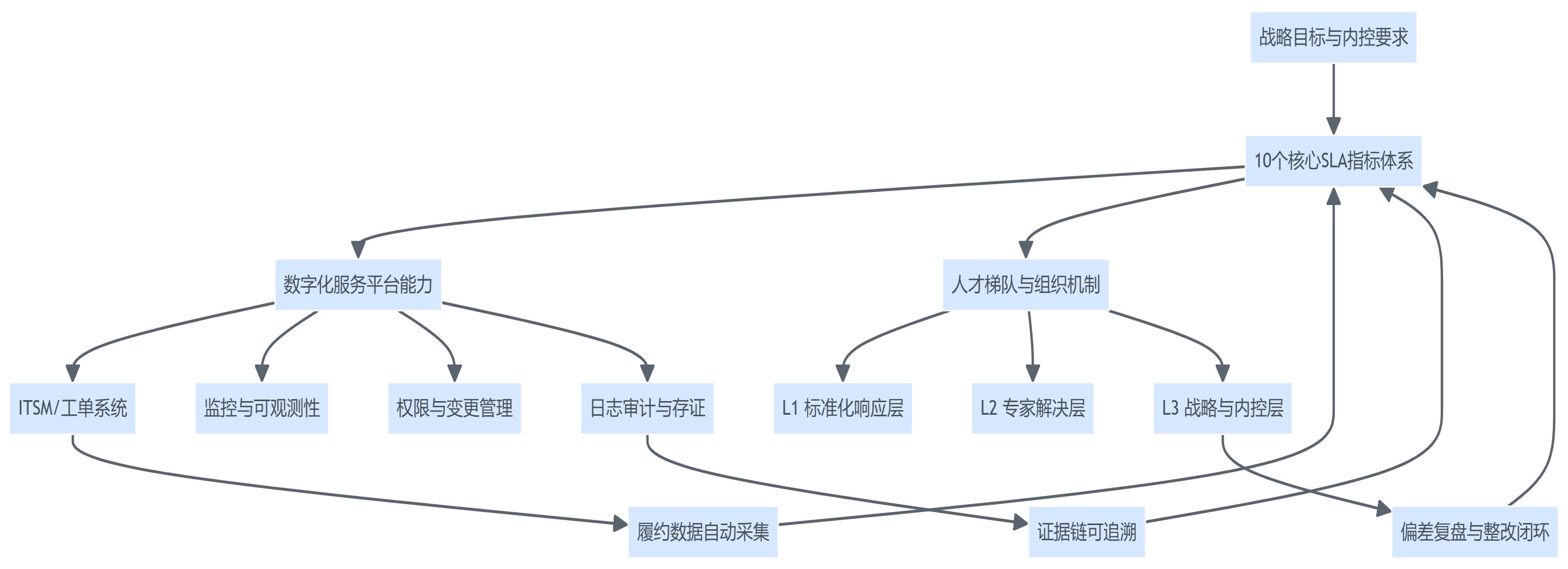 | L3 战略与内控层 | 服务治理负责人、内控合规官、安全负责人 | 指标口径设计、授权与审批机制、审计证据链、偏差复盘整改、供应商治理 | 内控预警触发率、数据安全响应率、第三方审计整改闭环率 |