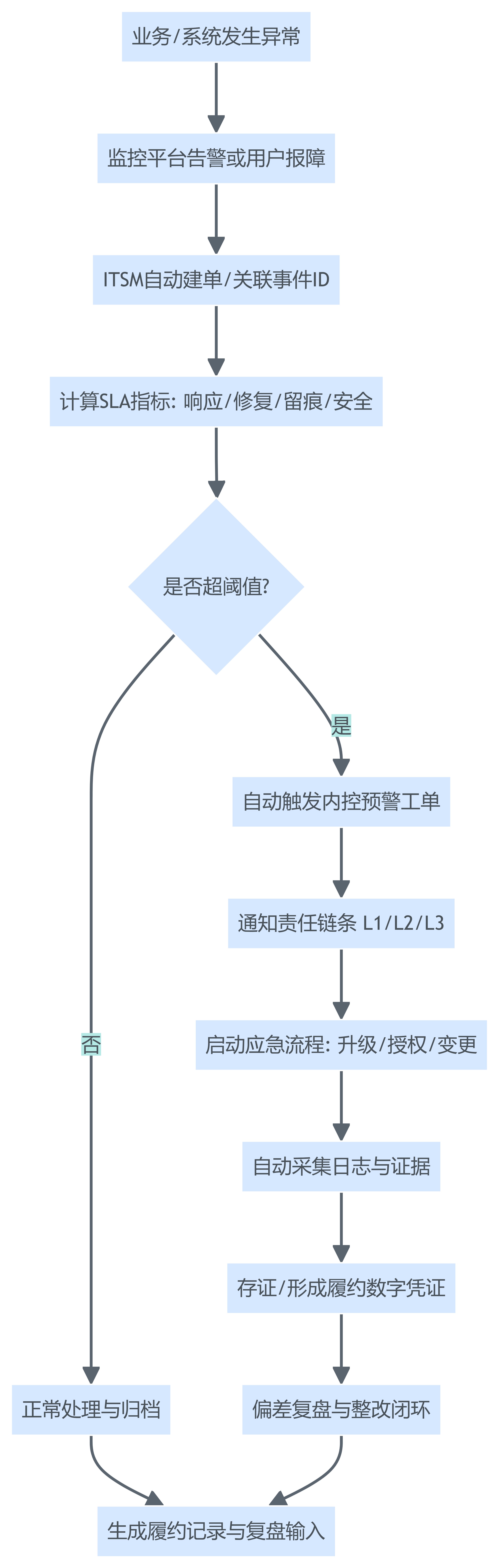当三类数据能在同一口径下对齐(例如以事件ID/工单ID关联),SLA才具备自动化治理基础。否则,SLA会退化为“人为填报指标”,既增加负担又难以通过审计抽查。
