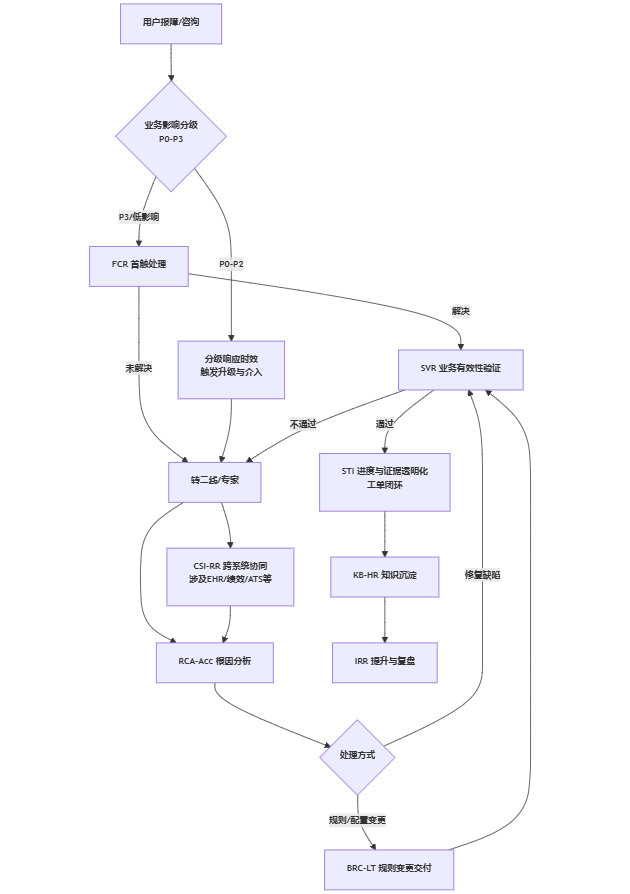 | 解决方案有效性验证率 | SVR | 修复后业务验证通过占比 | 定义“真解决” | 验证脚本、签收记录 | 需沙箱/脱敏与验证责任人 |