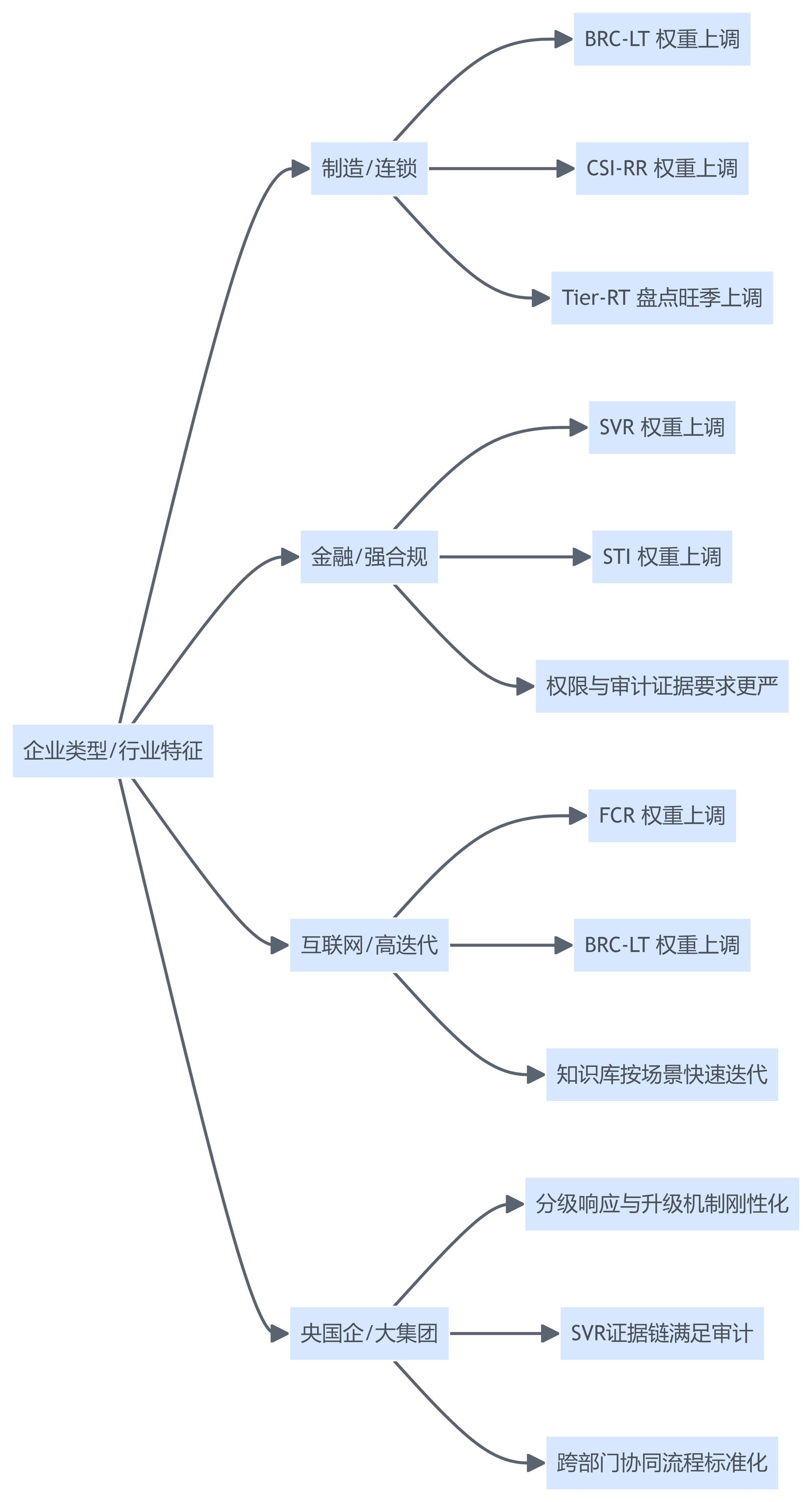 - 制造业/连锁业:组织层级多、班组结构复杂,规则与主数据变更多,BRC-LT和CSI-RR通常权重更高。