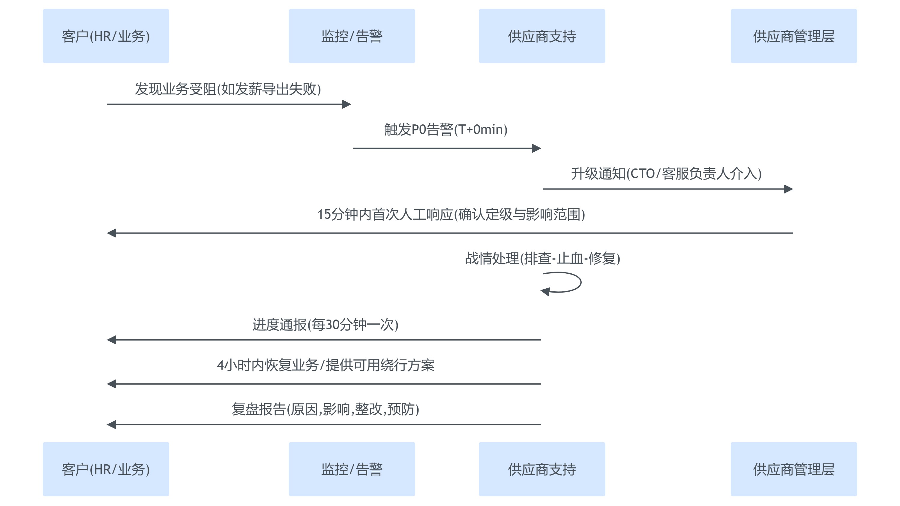 - P0:全站不可用、疑似数据泄露、核心业务无法开展(如发薪导出失败且无替代路径)