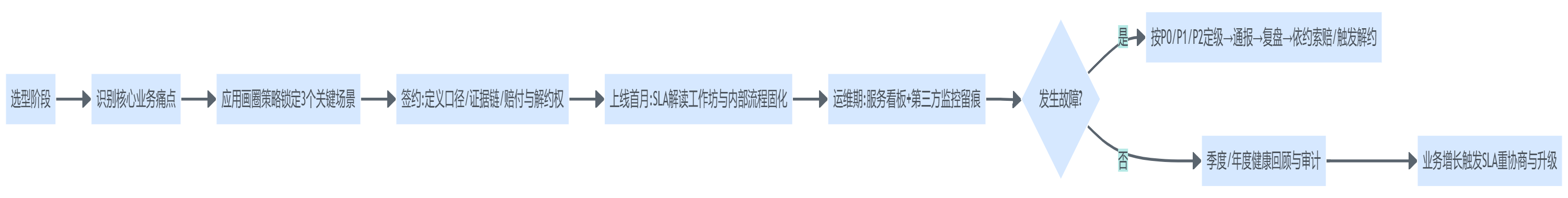 中小企业不要试图把每一条SLA都谈到最优,否则谈判成本高、供应商也会用整体涨价来对冲。更有效的方法是“画圈”:圈出企业最不能失败的3个业务场景,把它们写成端到端指标与故障分级条款。例如: