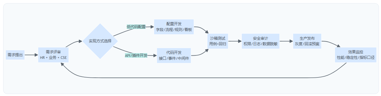 这张流程图的价值在于:它把“二次开发”从一次性开发,变成持续迭代的治理闭环。只要供应商无法支持其中的关键环节(尤其是沙箱、审计、灰度与回滚),就要谨慎评估其长期适配性。