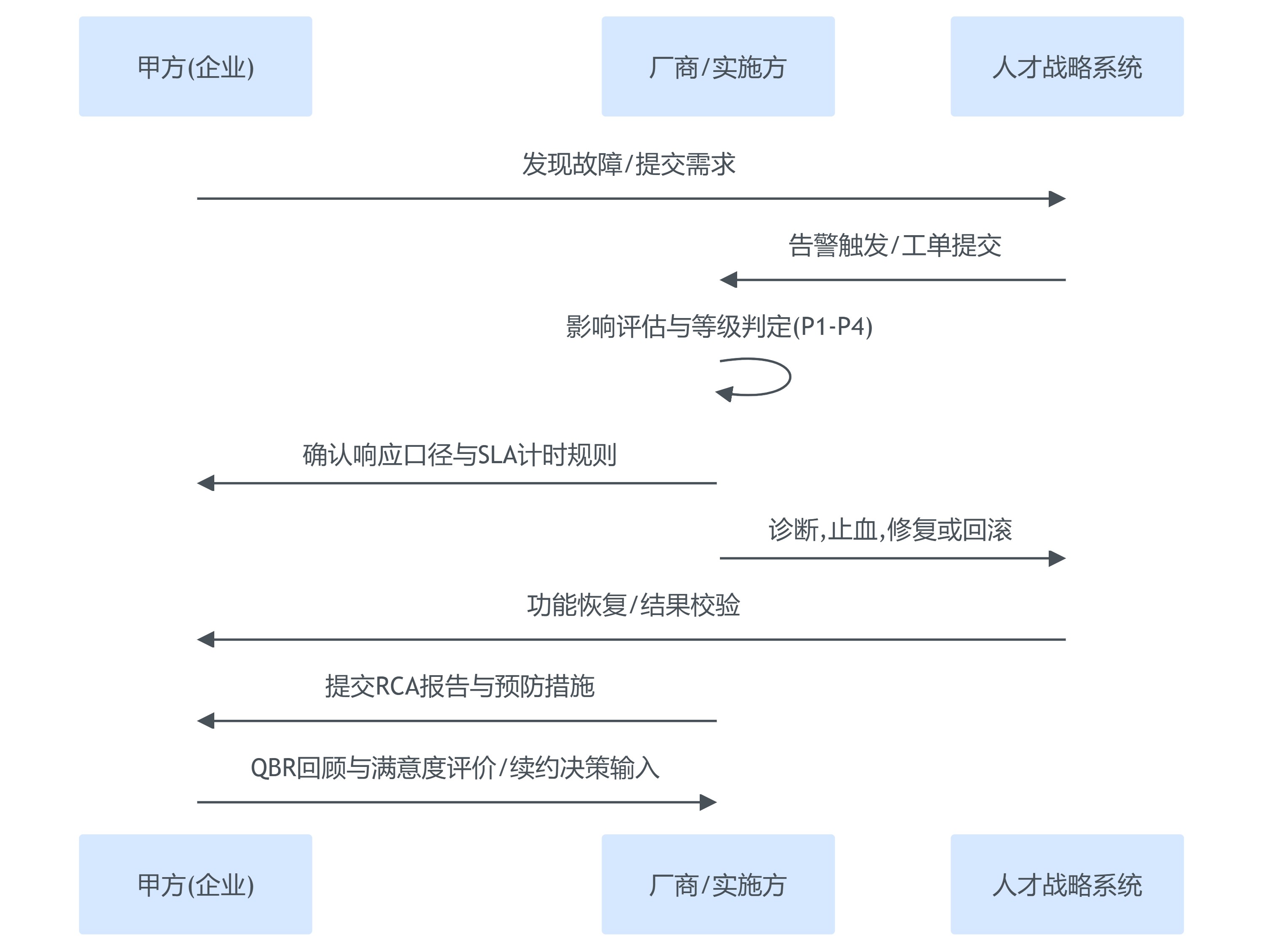 | 分级响应时效 | P1-P4分级,定义响应证据与升级机制 | P1响应≤15min;P2响应≤2h | 宕机、薪酬出数失败、登录故障 |