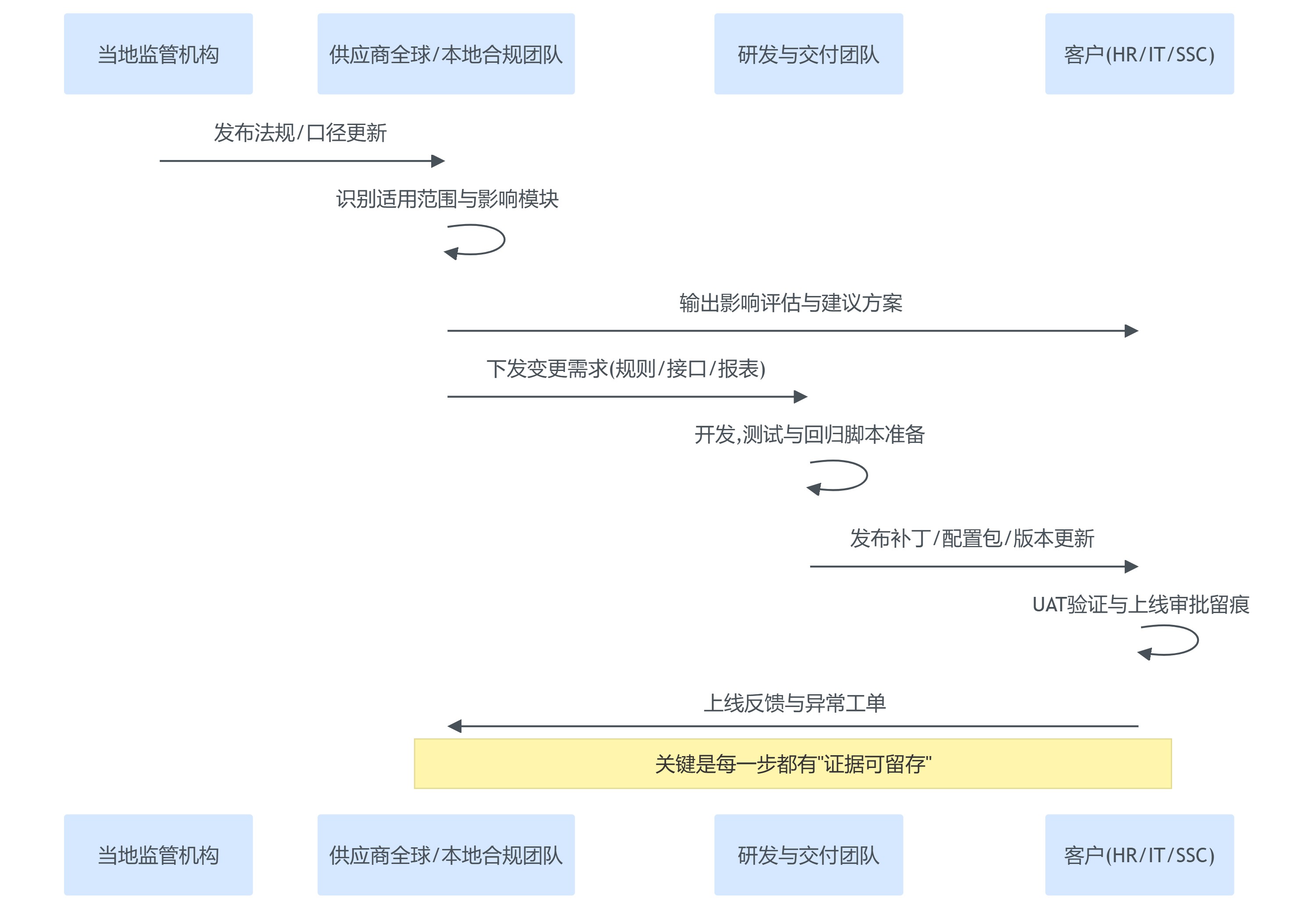 法规变化不是“通知一下客户”就结束了,它会穿透到薪酬规则、假勤、合同模板、报表口径、字段定义,最终落到系统配置与版本发布。全球化售后能力的差异,往往体现在法规落地速度与落地质量两点上。