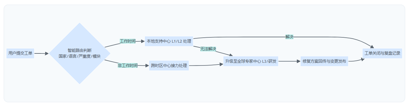 - 现象与痛点:跨国公司常见的事故场景是:亚太区下班前报了故障,供应商说“已升级总部”;总部团队上线后发现信息不全,反复问询;等到真正定位问题,亚太区又进入工作时间,业务已受影响。结果看起来是“有支持”,本质是“没有接力”。