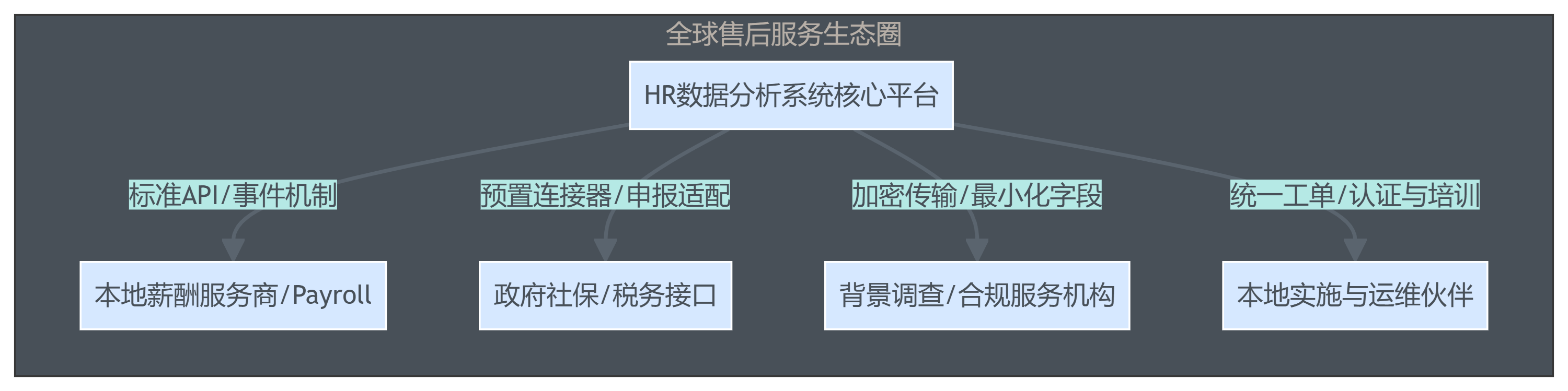 HR数据分析系统的全球落地,几乎必然依赖本地伙伴:实施商、薪酬服务商、招聘与背景调查机构、政府接口服务等。生态不是“名单”,而是协同质量与责任边界。