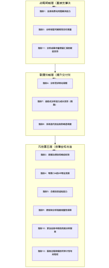 12项指标不是简单清单,它们更像一套从底层到顶层的价值结构:底层保证合规与连续,中层保证交付效率,顶层保证洞察进入决策。缺任意一层,满意度都会出现“短板效应”(这是本模块唯一的类比)。