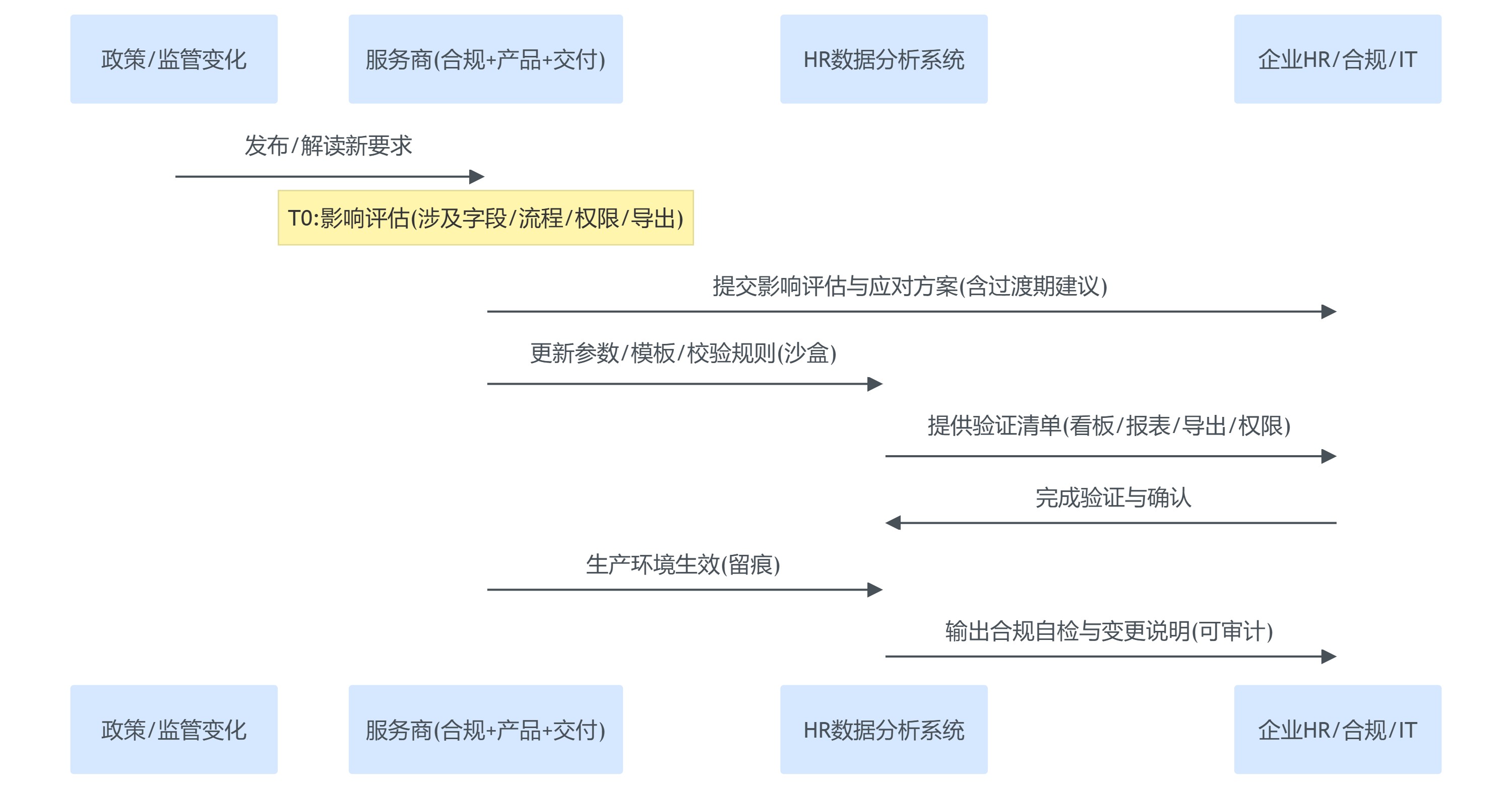 下面用时序图示意“合规动态适配”的SLA闭环如何写得可执行: