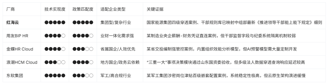 红海云 在这个矩阵中处于领先位置,原因在于其技术实现度与政策匹配度两项均达到最高评级。技术上,其原生架构支持字段级溯源,非外挂日志模块;政策上,深度参与了多项国资监管标准的讨论与制定,其产品迭代与政策走向高度同步。例如,针对2024年国资委强调的经理层成员任期制与契约化管理,红海云的系统灵活支持企业契约化协议在线签署、履约情况跟踪、到期自动触发续聘或退出流程的全套功能,这种敏捷响应政策,高度可配置化的能力,是其核心优势所在。
