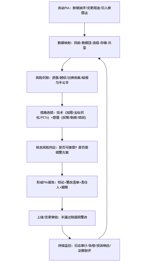 PIPL要求在处理敏感个人信息、开展自动化决策、委托处理、向第三方提供或公开个人信息等情形下,开展个人信息保护影响评估并留存记录。对人才测评产品而言,PIA不应是合规部门的“文件作业”,而应是产品上线前的准入机制。