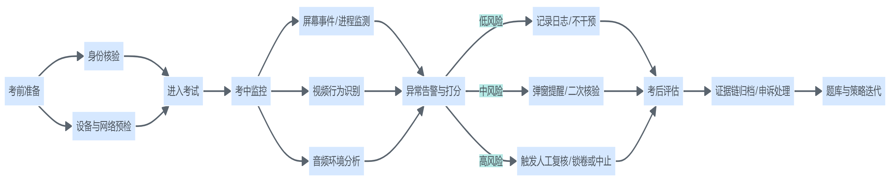 | 优点 | 直接解决“人不对”的根风险 | 可检测、可限制、可留痕;对大规模考试性价比高 | 覆盖隐蔽作弊;可做风险分层,减少全量人工 |
