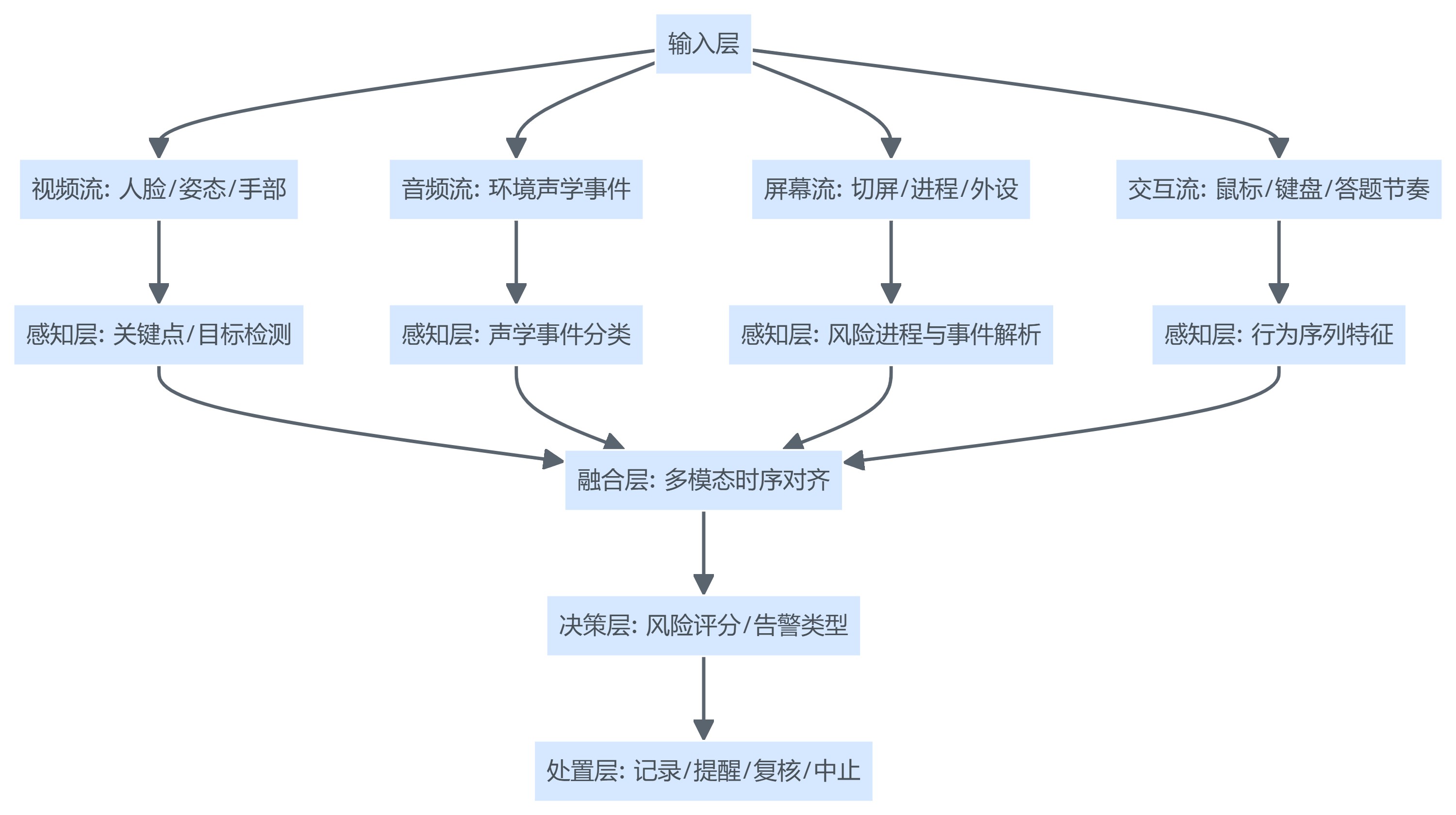 | 技术原理 | 人脸比对 + 活体检测 + 关键节点复核 | OS/浏览器事件、进程识别、切屏与剪贴板监测 | 视频/音频/交互多模态特征提取 + 模型判别/风险评分 |