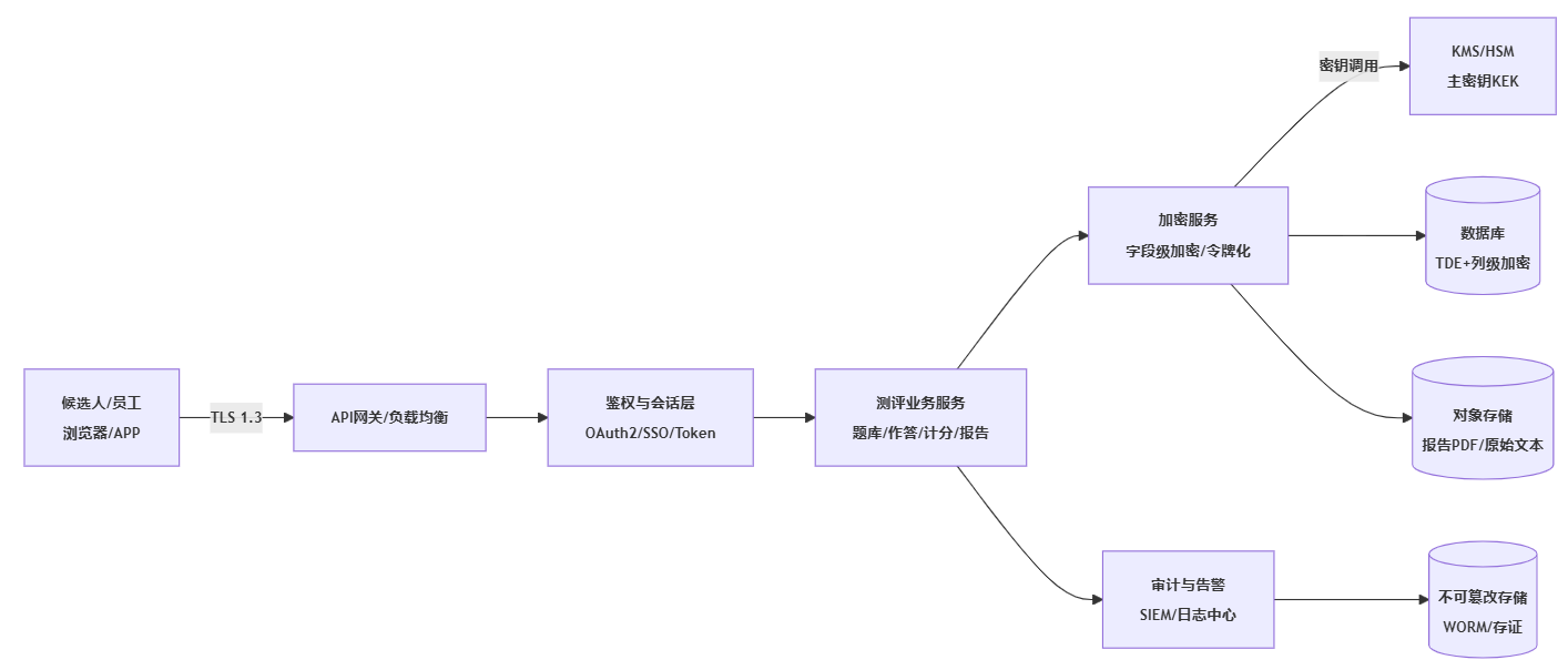 - 数据对象:候选人列表、测评作答、维度得分、报告全文、开放题原文、导出文件、接口数据集;