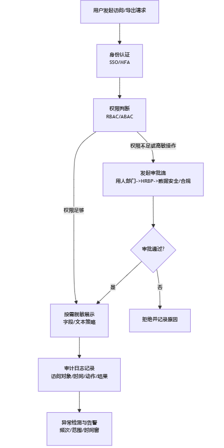 - 异常行为告警:短时间内大量访问、跨范围访问、夜间导出、导出失败重试等,触发告警并可自动冻结会话。