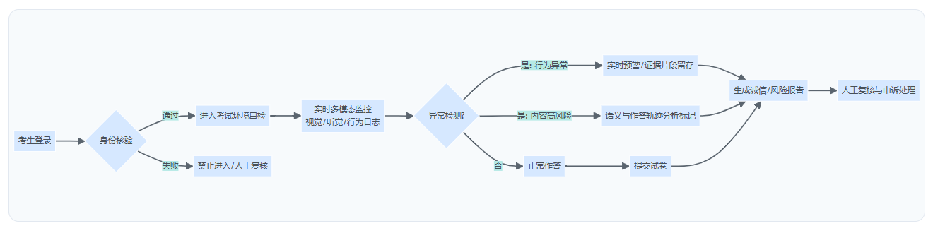 | 内容检测 | 查重、题库泄露后追责 | 语义一致性/风格漂移/作答轨迹联合分析,用于识别疑似代答 |