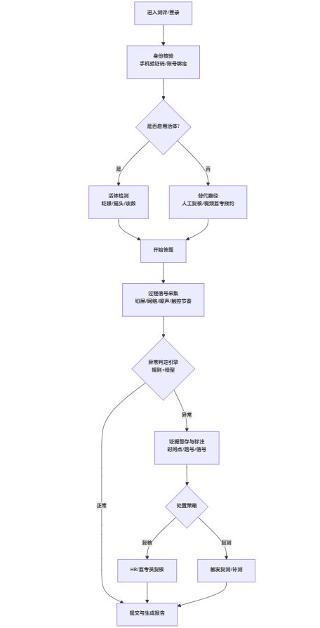 - 按证据链输出:给HR的不是“判定作弊”,而是“异常类型 + 证据摘要 + 复核建议”,例如:切屏次数、活体失败次数、噪声突变时间点、作答节奏突变题号。