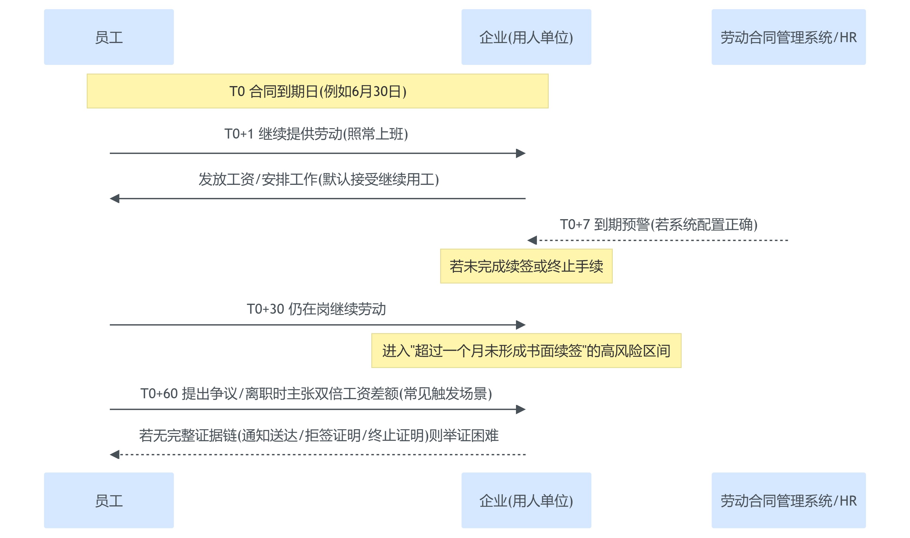 - 起算点:合同到期次日开始,如果员工继续提供劳动且企业接受,就进入“无书面合同覆盖”的风险区间。