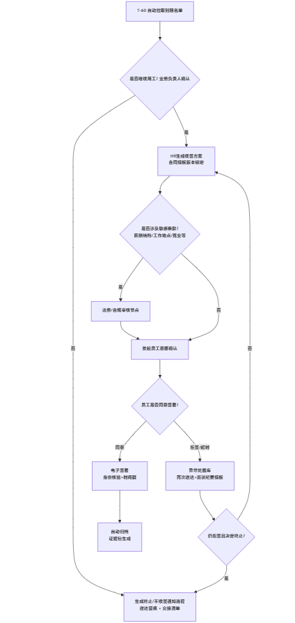SOP设计的目标是两句话:到期前把决定做完,到期日把文本签完;签不下来也要把终止动作做完并留痕。以下是一个可复用的流程框架(企业可按岗位类别设置不同审批深度):