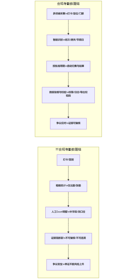 图表1:不合规考勤数据链 vs. 合规考勤数据链(流程对照)