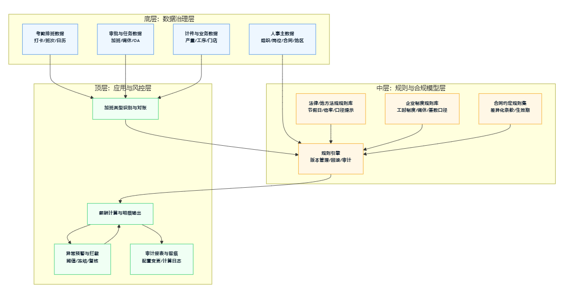 2)加班类型识别前置到考勤侧:考勤侧产出结构化数据(工作日延时/休息日/节假日/调休抵扣后剩余/周期超时),薪酬侧只做规则计算与审核。