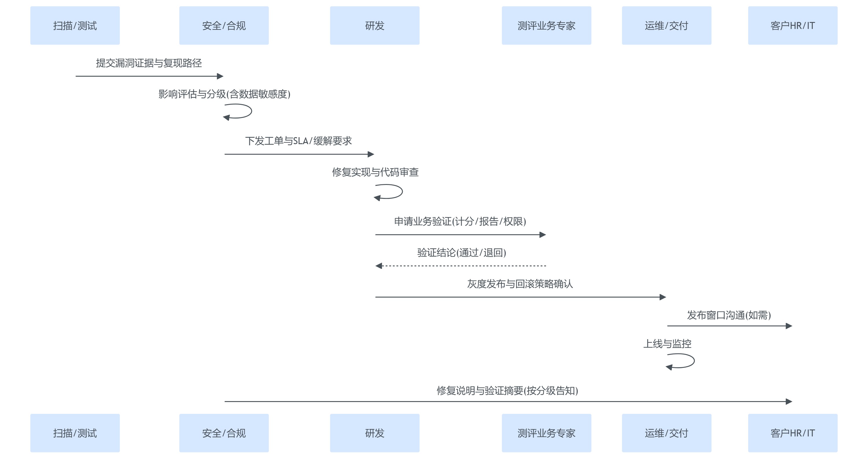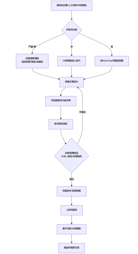 | 修复验证 | 技术验证(能跑通、能上线) | 技术验证 + 业务逻辑验证(计分一致性/权限矩阵) |