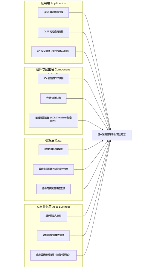 | 扫描范围 | 以Web漏洞扫描为主 | 覆盖代码、API、依赖、配置、数据与AI层 |
