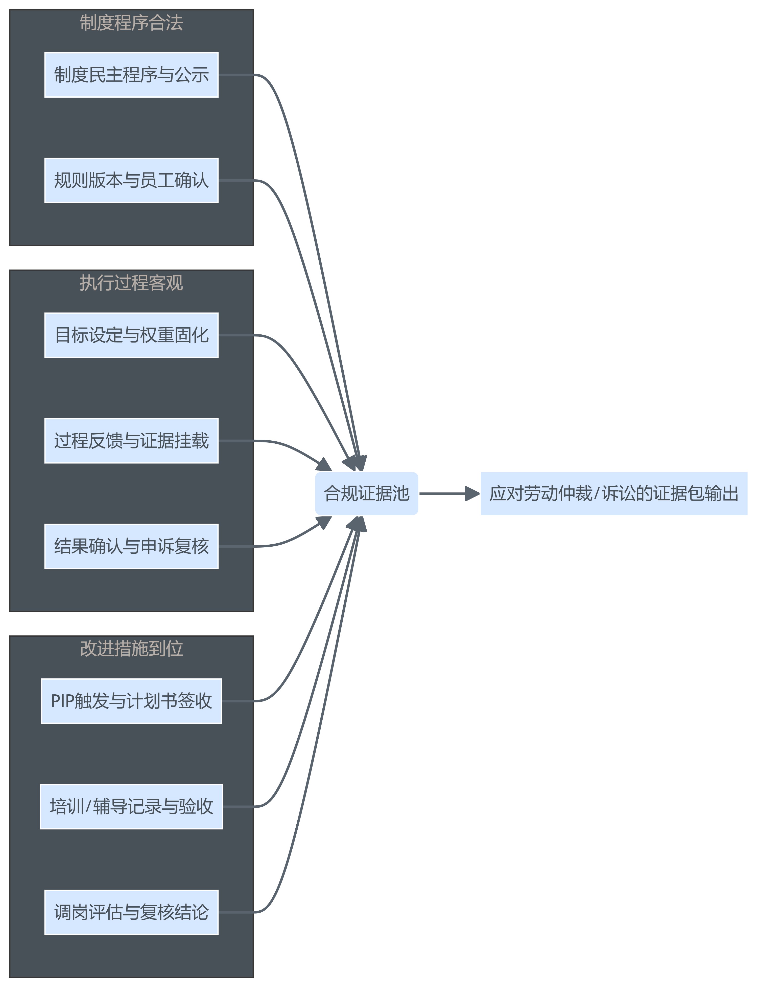 | 证据要求 | 打分表/排名截图 | 考核记录+面谈纪要+培训/调岗+复核材料 |