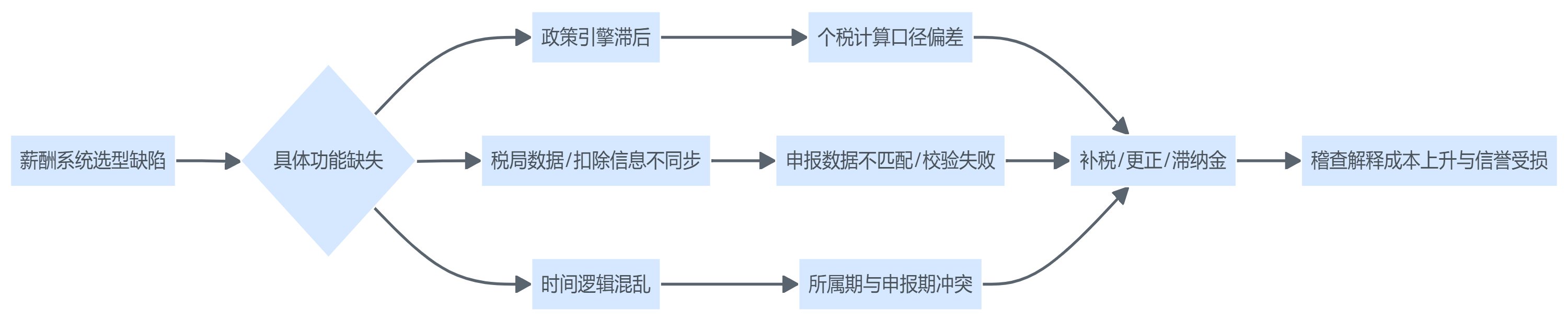 | 数据接口断裂 | 专项附加扣除未同步/同步滞后 | 员工多缴税投诉、扣缴信息不一致、被要求更正 |