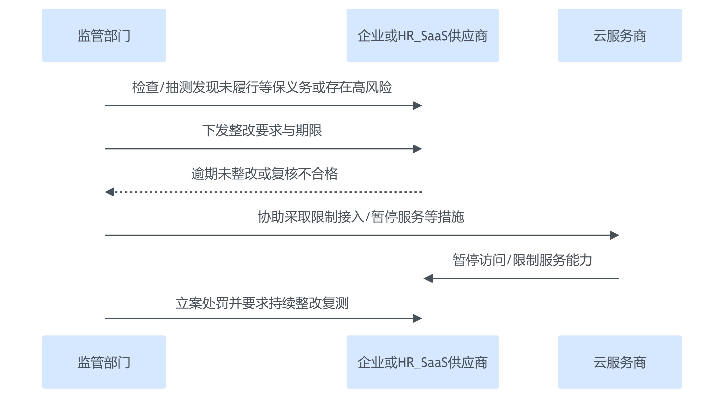 对HR SaaS而言,“暂停相关业务”的可执行性很强:一方面,SaaS天然依赖云资源、网络接入、域名解析、应用分发等关键基础设施;另一方面,客户侧往往缺少可快速切换的备份系统,一旦供应商被限制提供服务,业务冲击会被放大。可以把它理解为监管的“熔断机制”——不是为了惩罚而惩罚,而是为了把已暴露的系统性风险迅速止损(这也是本模块唯一的类比点)。
