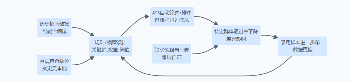 当ATS从“管理工具”变成“自动决策工具”,企业需要认识到:黑箱不是技术问题,而是治理问题。为了把偏见形成与传导讲清楚,我们用一张流程图把路径画出来,便于跨部门对齐整改点位。