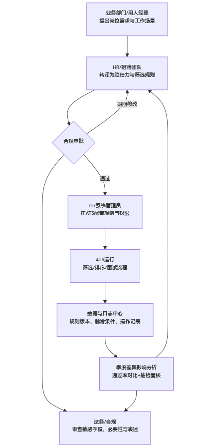 很多企业的现实情况是:ATS由业务部门采购或IT部署,HR只负责使用;规则配置被视为“招聘流程的一部分”,很少进入法务审查清单。于是出现三个典型盲区: