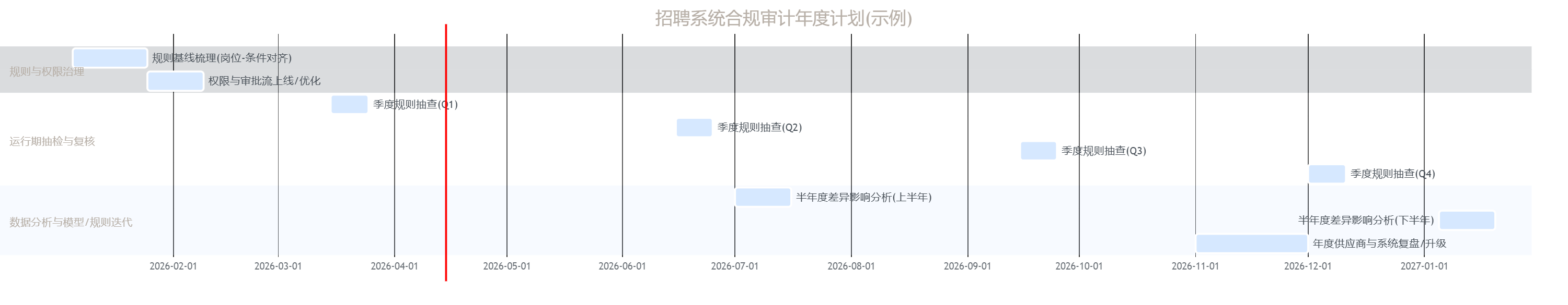 为了让治理不流于形式,需要配套一个年度节奏:什么时候做规则抽查,什么时候做差异影响分析,什么时候做系统升级与供应商复盘。下图给出一个可执行的年度计划模板(企业可按招聘季节调整)。