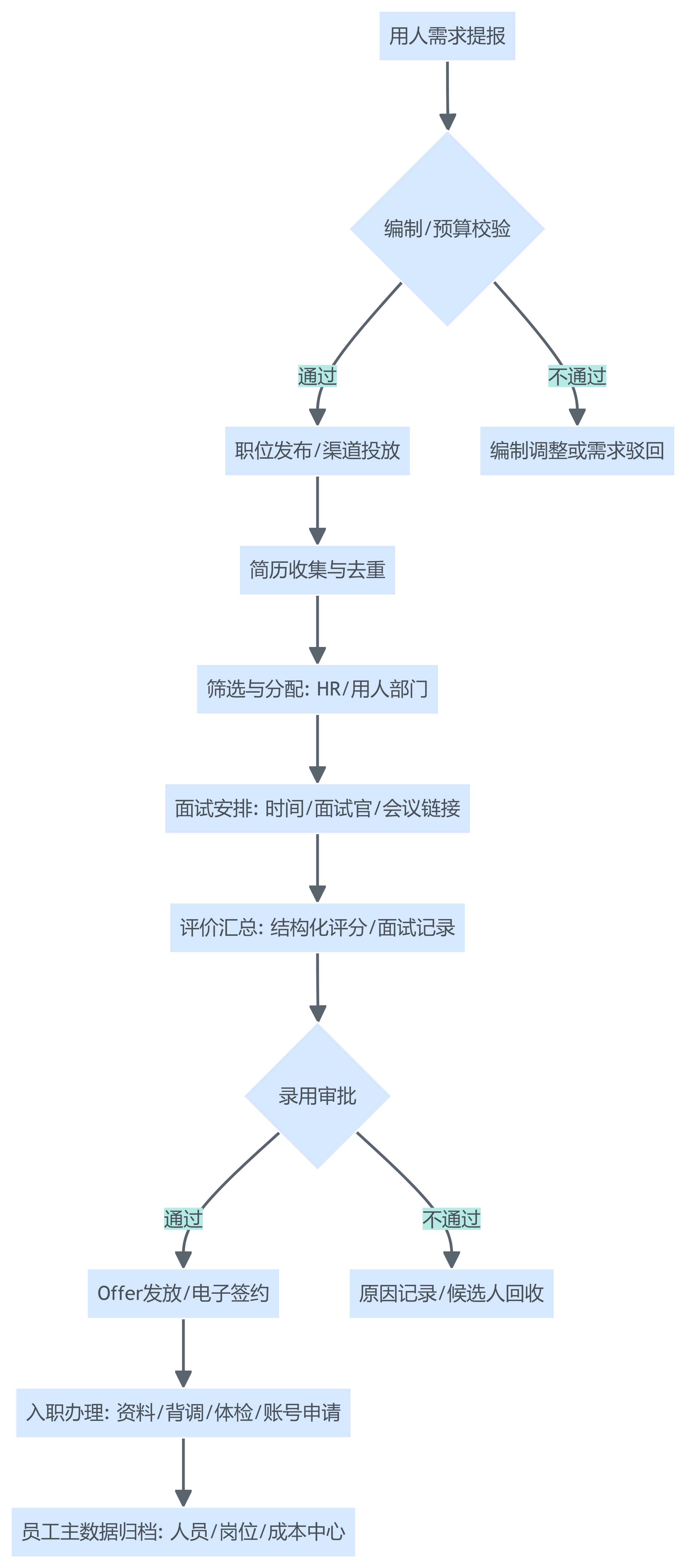 如果把招聘当作流程,合格系统至少要覆盖:需求提报—编制校验—职位发布—筛选分配—面试安排—评估汇总—录用审批—电子签约—入职办理—数据归档。更进一步,要把能并联的环节并联起来,减少等待时间,例如背景调查与体检预约可在录用审批后自动触发,入职资料可由候选人在移动端提前提交。