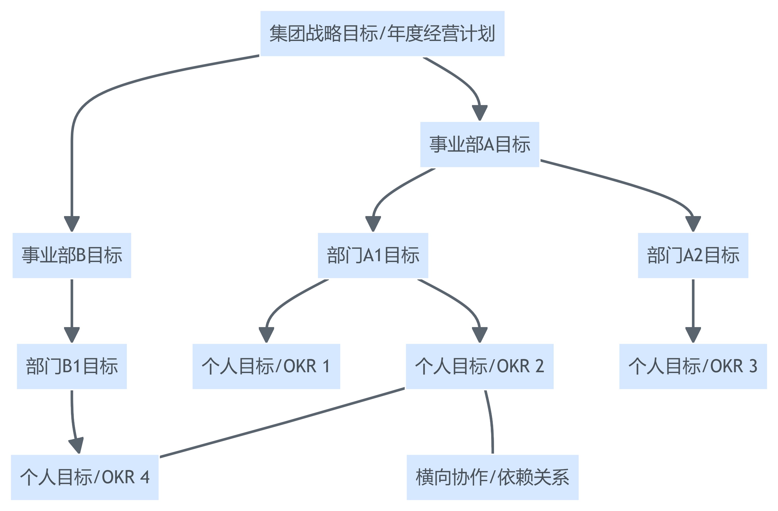- 纵向分解:集团战略目标—事业部目标—部门目标—个人目标,目标之间有父子关系与权重关系。
